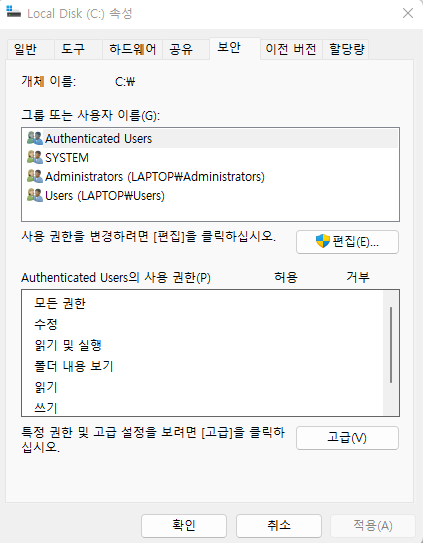 참고로 C 드라이브의 경우 추가로 Autheticated Users, Users 가 권한이 추가된 것을 확인할 수 있습니다.