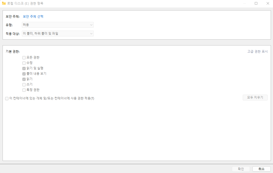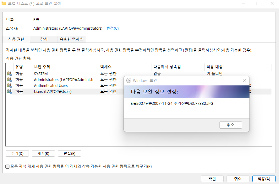 우선 E 드라이브에 권한이 어떻게 되어 있는 지 확인 위해