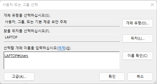 추가 버튼을 누르고, 보안 주제 선택 클릭, 선택할 개체 입력 란에 users 입력 후 이름 확인 버튼을 클릭하면