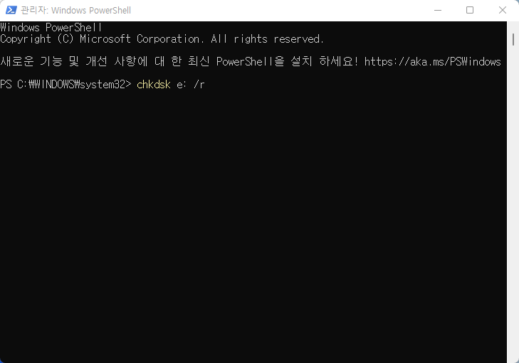 chkdsk e: /r 명령어를 입력하고 엔터 키를 눌러 실행합니다.