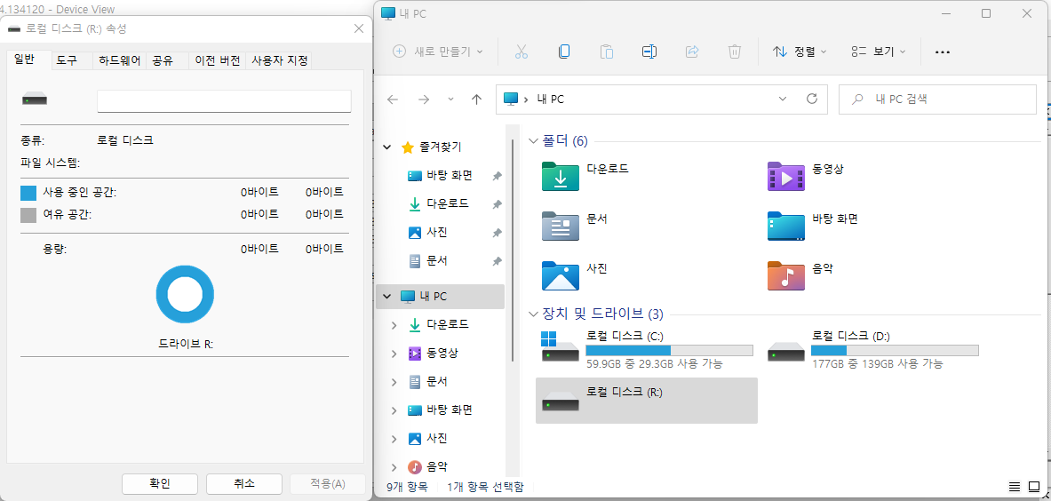 탐색기로 R 드라이브를 확인하니 용량은 0 바이트 확인 됩니다.