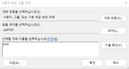 선택할 개체 입력 란에 auth 입력 후 이름 확인 버튼을 클릭하면