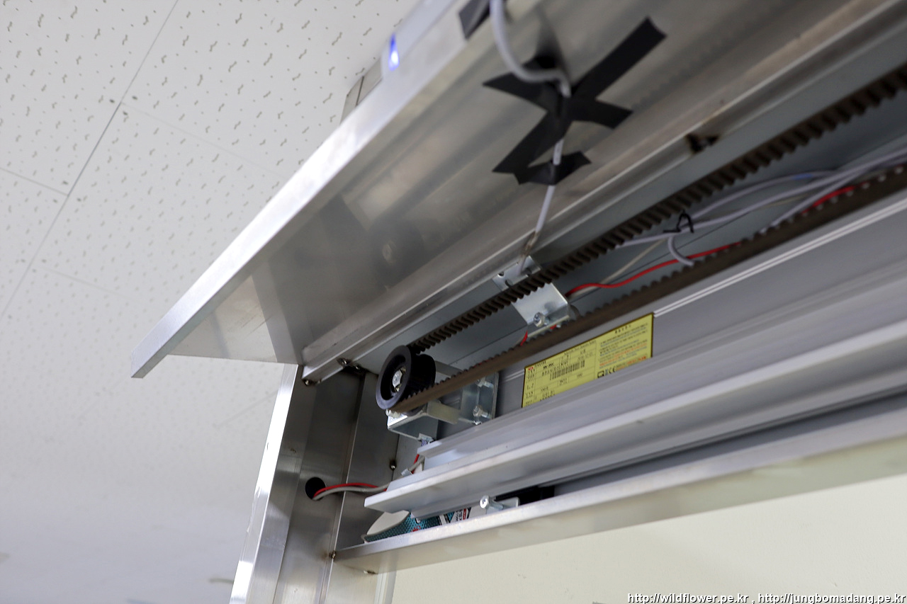 이렇게 문이 개방된 상태로 문 사이로 두개 자동문 센서의 설치된 모습입니다.